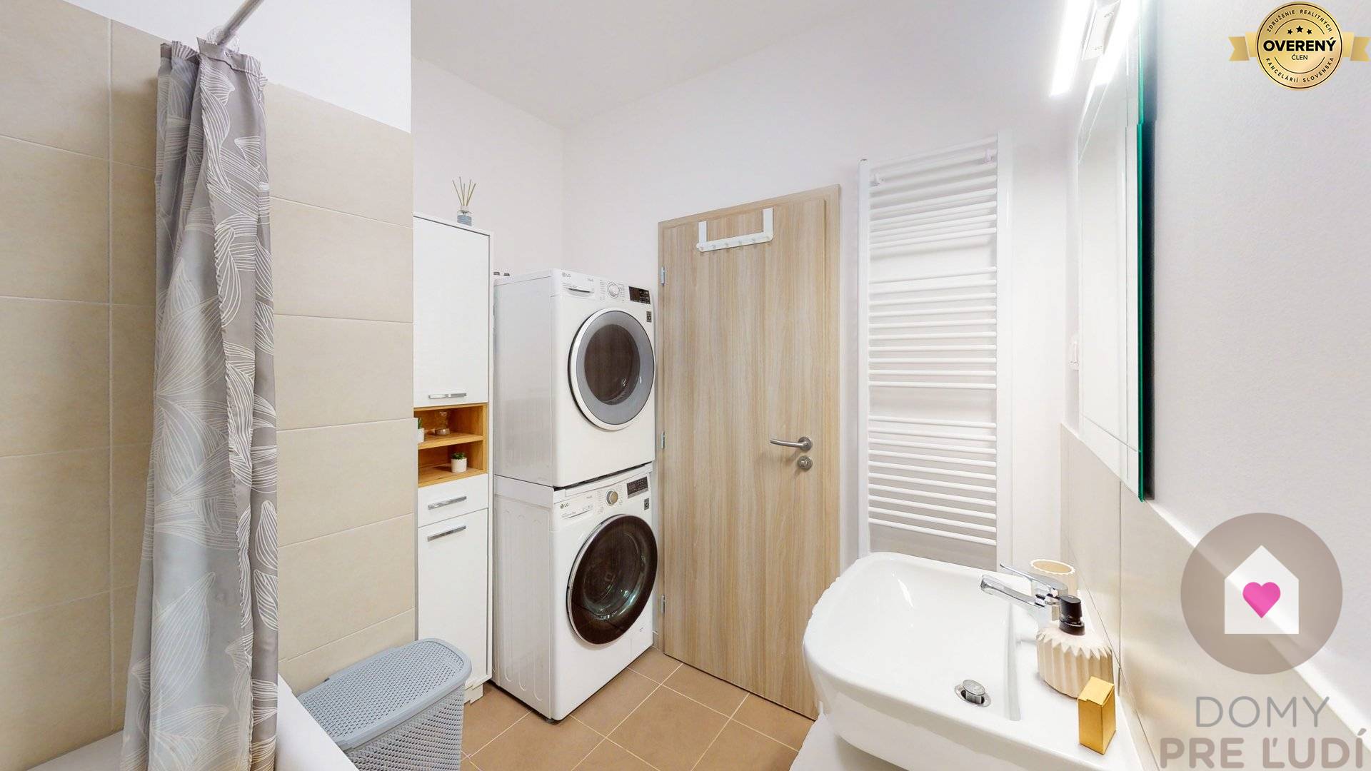 - Geräumiges Badezimmer mit Badewanne, Waschbecken, Waschmaschine und Trockner (LG)