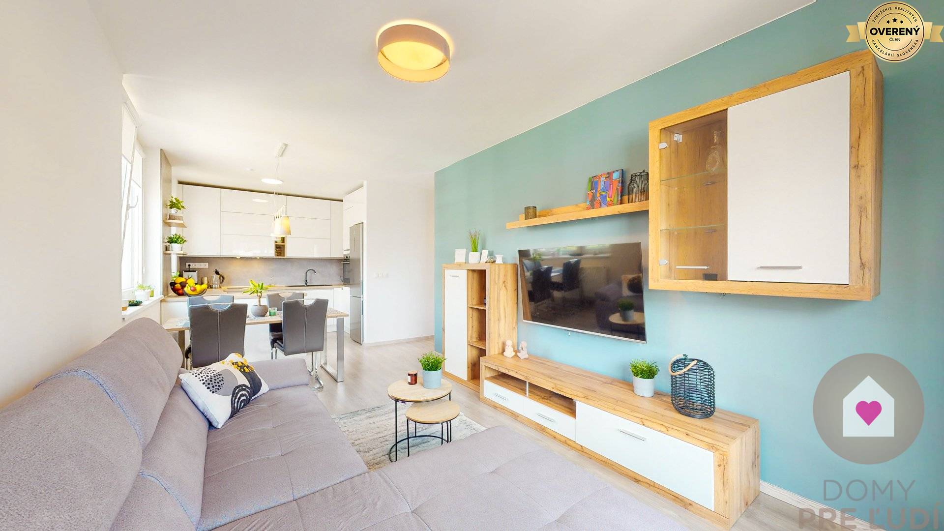 Die 65 m² große Wohnung besteht aus 3 Zimmern und ist mit einem großen Sofa, einem Fernseher, einem Couchtisch, einem Schrank, einem Beistelltisch und einem Esstisch mit Stühlen ausgestattet. Vom Wohnzimmer aus erreicht man einen großen Balkon mit Sitzgelegenheiten (8,36 m²), der sich über die gesamte Wohnungsbreite erstreckt und von jedem Zimmer aus zugänglich ist. - Voll ausgestattete Küche, die vom Wohnzimmer durch ihre Nische abgetrennt ist – mit Einbaukühlschrank mit Gefrierfach, Mikrowelle, Backofen, Induktionskochfeld, Geschirrspüler und Dunstabzugshaube