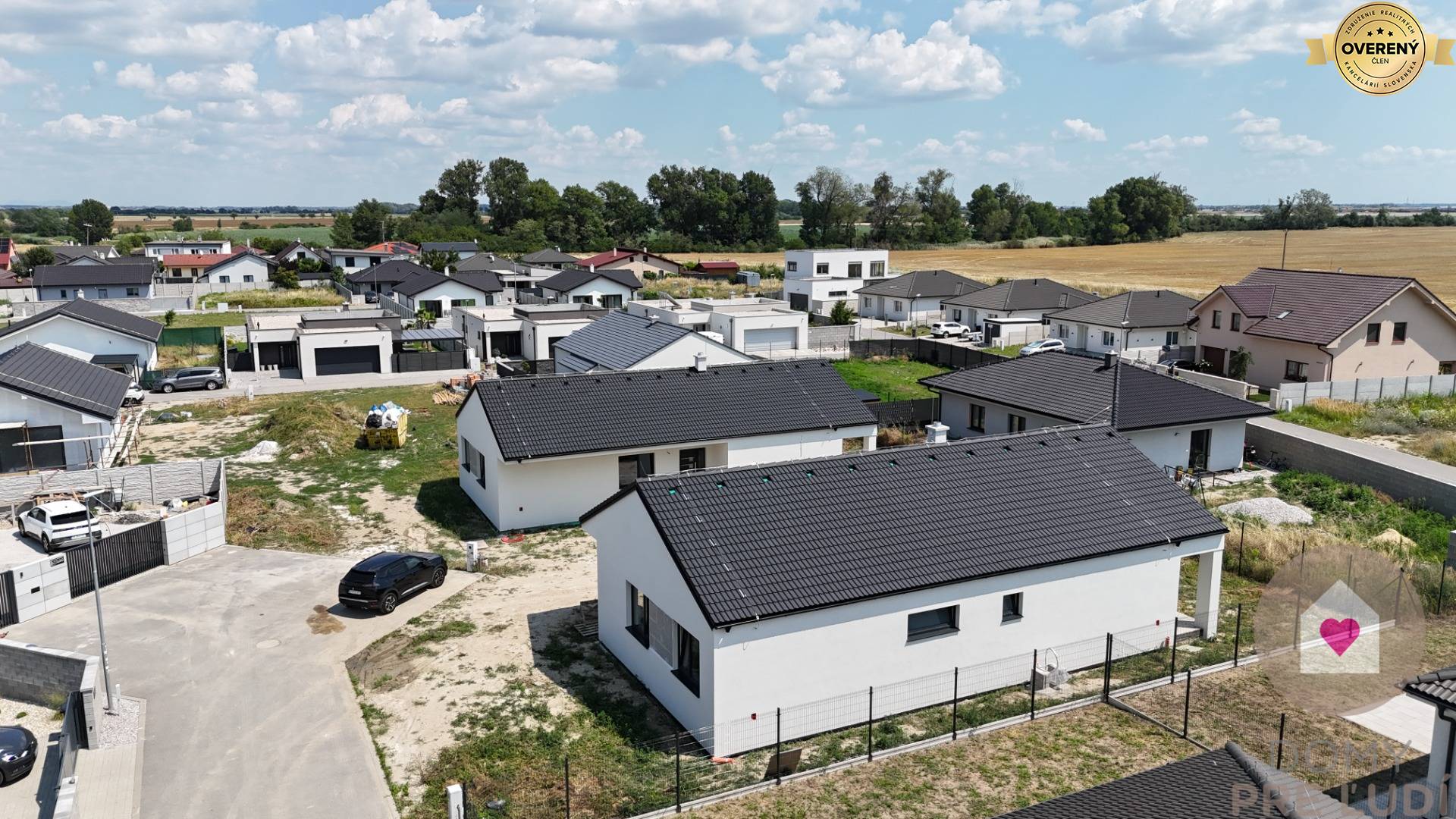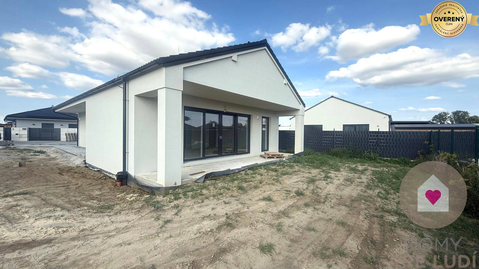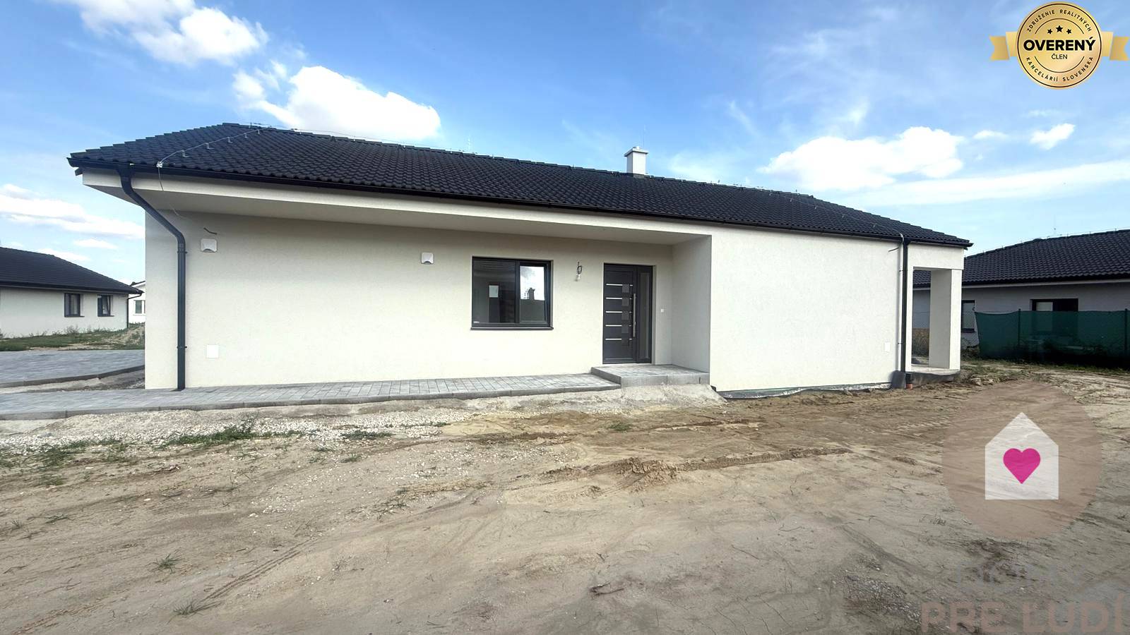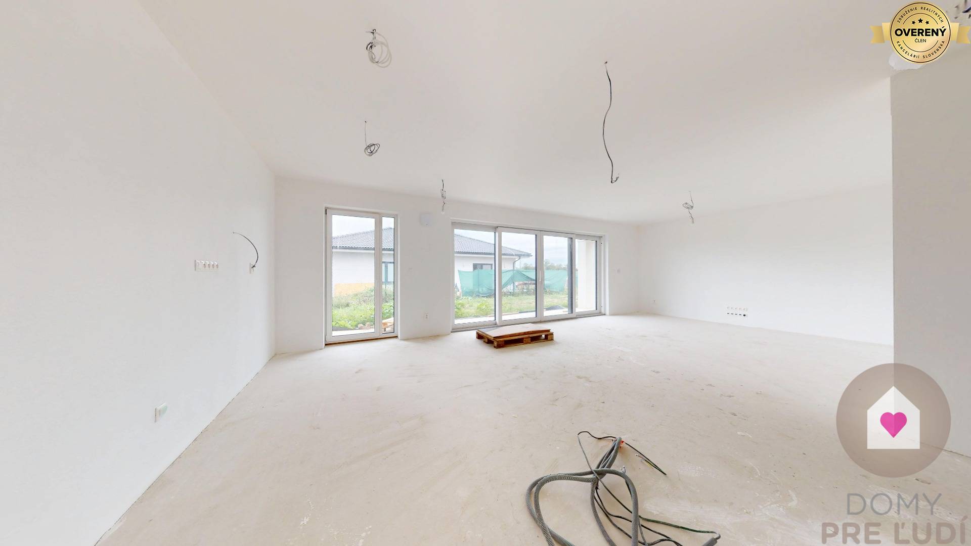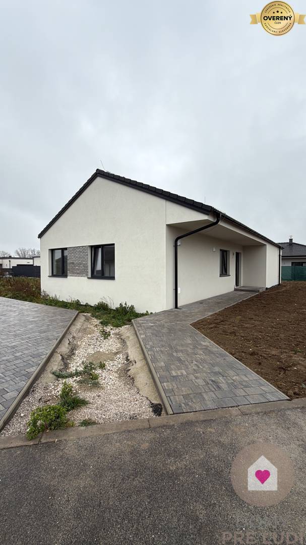 Für das Haus wurden Standardmaterialien verwendet – Außen- und Tragwände aus poliertem Pezinok-Ziegel 30–300 mm, Dacheindeckung MEDITERAN oder BRAMAC – schwarz, Dachdämmung Mineralwolle 300 mm + Dämmung 80 mm • Fassadenisolierung – Polystyrol 150 mm. Fassadenfarbe – weißer Putz. Das Haus hat Kunststofffenster und Eingangstüren – 3 von außen laminierte Gläser in Anthrazit SALAMANDER. Fußböden – Polystyrol- und Estrichboden, vorbereitet für Fliesen und schwimmende Estriche, komplette Elektroinstallation, weiße Schalter und Steckdosen, Datenverkabelung laut Projekt, Vorbereitung für die Möglichkeit des Anschlusses zusätzlicher Datennetze. Das Haus wird über eine komplette elektrische Fußbodenheizung mit Warmwasserspeicher, komplette Wasserinstallation, Wände – Putz + weiße Grundfarbe, komplette Gipskartonplatten, Vorbereitung für einen Kamin verfügen. Das Haus wird an die Versorgungseinrichtungen angeschlossen – Wasser, Strom, Abwasser. Das Haus wird auf einem unbebauten Grundstück verkauft. Das Grundstück rund um das Haus ist vom Fundament aus ebenerdig, ohne Gehwege und Zaun.