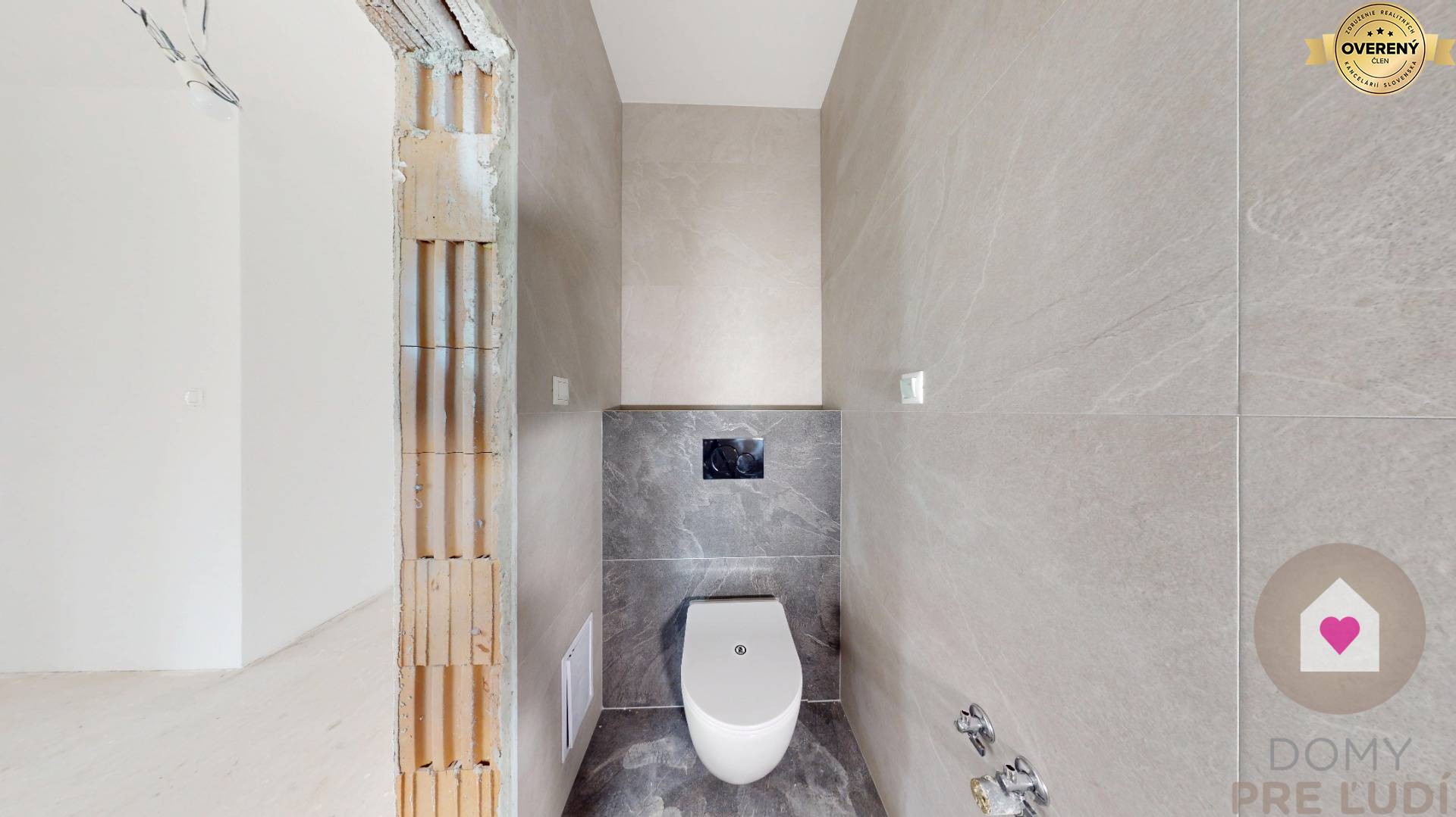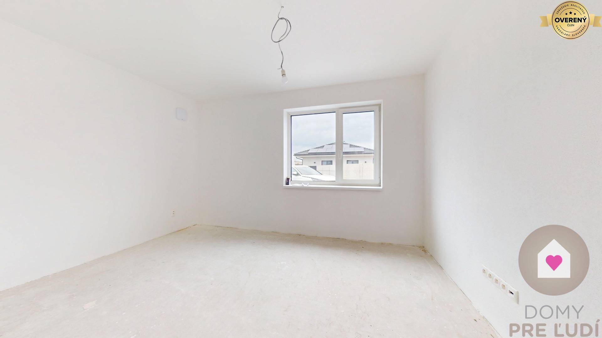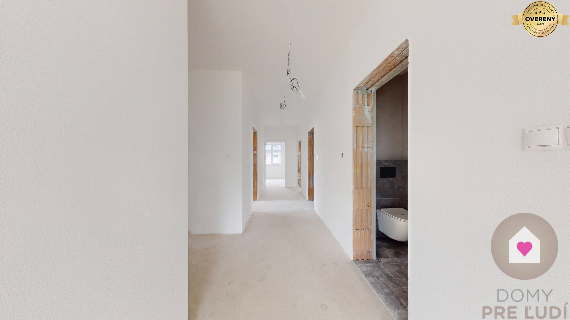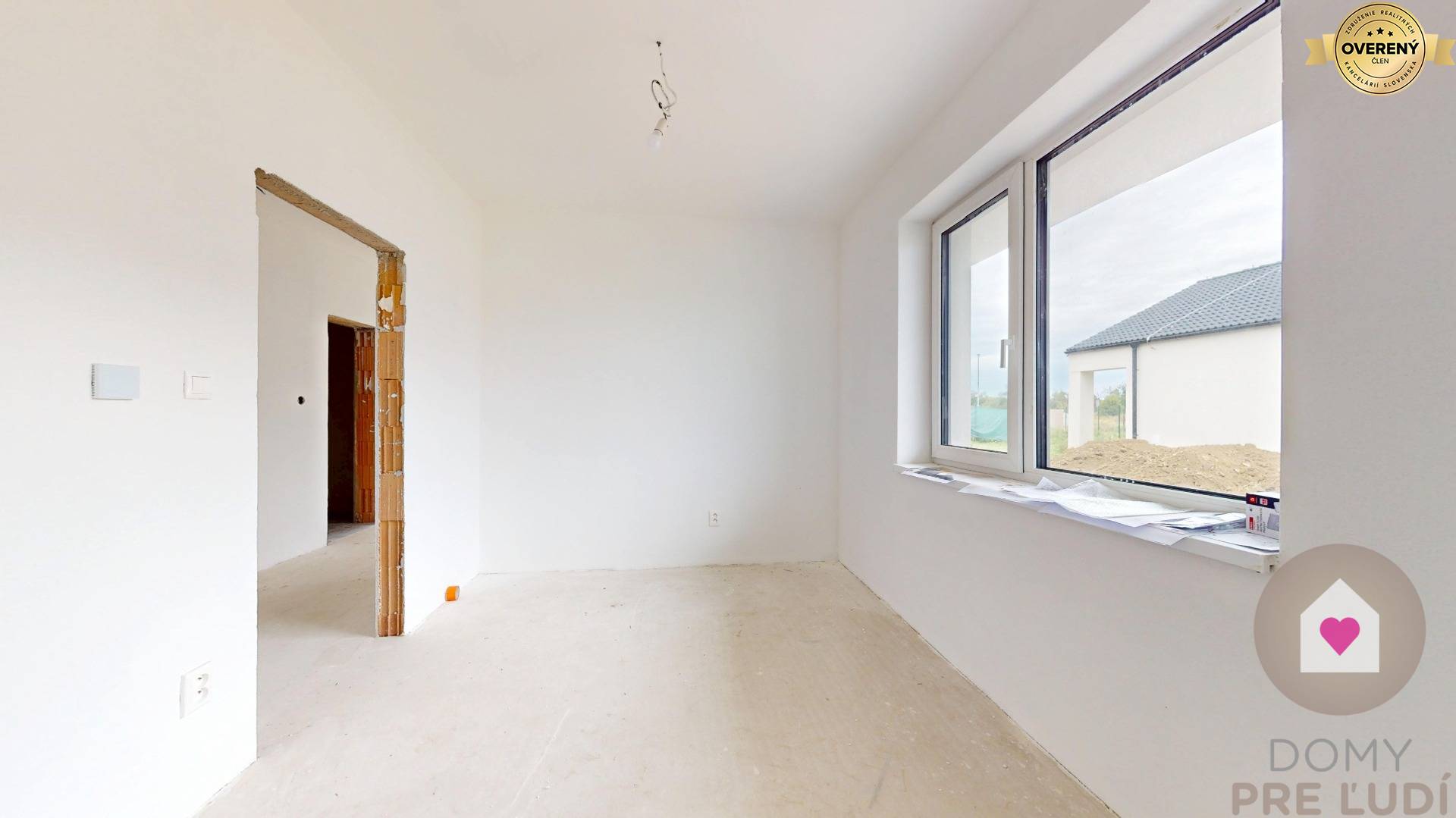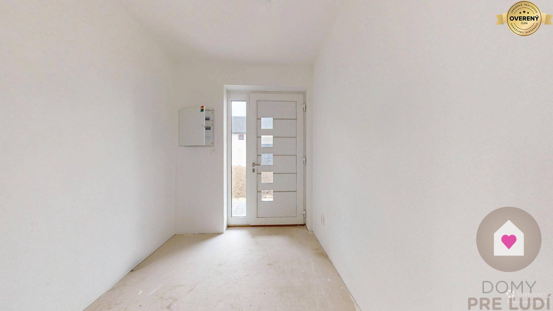 Für das Haus wurden Standardmaterialien verwendet – Außen- und Tragwände aus poliertem Pezinok-Ziegel 30–300 mm, Dacheindeckung MEDITERAN oder BRAMAC – schwarz, Dachdämmung Mineralwolle 300 mm + Dämmung 80 mm • Fassadenisolierung – Polystyrol 150 mm. Fassadenfarbe – weißer Putz. Das Haus hat Kunststofffenster und Eingangstüren – 3 von außen laminierte Gläser in Anthrazit SALAMANDER. Fußböden – Polystyrol- und Estrichboden, vorbereitet für Fliesen und schwimmende Estriche, komplette Elektroinstallation, weiße Schalter und Steckdosen, Datenverkabelung laut Projekt, Vorbereitung für die Möglichkeit des Anschlusses zusätzlicher Datennetze. Das Haus wird über eine komplette elektrische Fußbodenheizung mit Warmwasserspeicher, komplette Wasserinstallation, Wände – Putz + weiße Grundfarbe, komplette Gipskartonplatten, Vorbereitung für einen Kamin verfügen. Das Haus wird an die Versorgungseinrichtungen angeschlossen – Wasser, Strom, Abwasser. Das Haus wird auf einem unbebauten Grundstück verkauft. Das Grundstück rund um das Haus ist vom Fundament aus ebenerdig, ohne Gehwege und Zaun.